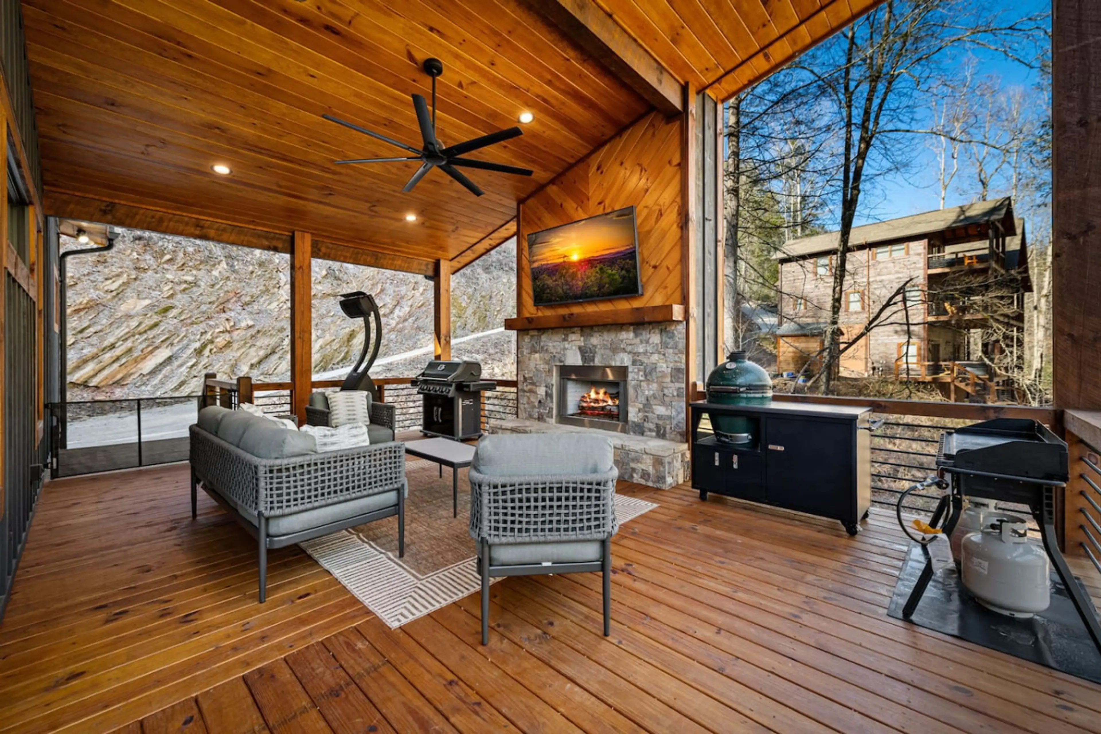 A cozy yet spacious mountain cabin that sleeps up to 11 guests, featuring three king suites and a full-over-queen bunk room with beautifully appointed bathrooms. The open-concept kitchen flows into the main living area, while a second kitchen and entertainment level with arcade games, foosball, and ...